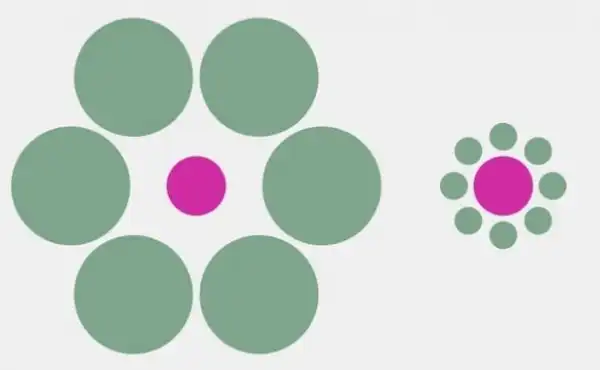 Розовые круги на самом деле одинакового размера. Один и тот же предмет воспринимается как более крупный среди маленьких предметов, и маленьким – в окружении крупных.