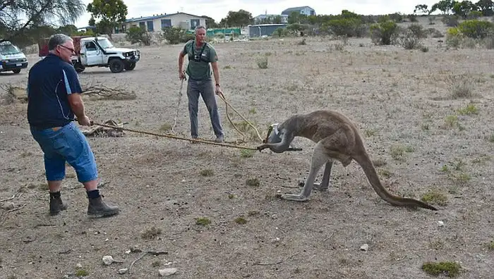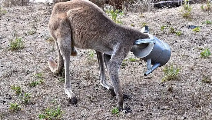 В субботу в городе Коффин Бэй, Австралия, любители игры в гольф могли наблюдать интересную картину, как двое мужчин пытались высвободить голову кенгуру из лейки. Животное обнаружило лейку с водой близ лужайки для гольфа, и его голова застряла в ней. Это заметили люди, которые бросились на помощь сумчатому млекопитающему, вооружившись веревкой и ножницами по металлу. После нескольких неудачных попыток кенгуру было спасено.