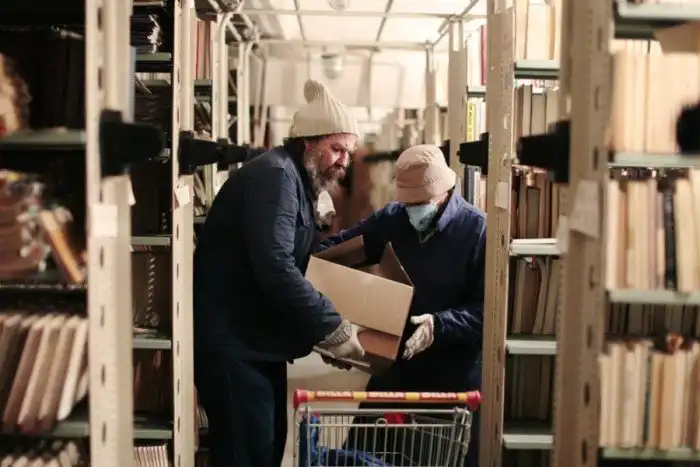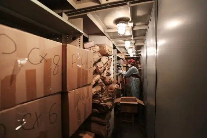 Потом настала очередь эвакуации мокрых книг. Только за 4 дня было вывезено 80 тонн книг, ежедневно вывозят по 20 – 30 тонн книг. Мокрые книги помещают в пластиковые ящики, а затем отправляют в криокамеры, где они ожидают своей очереди на сушку. Сгоревшие экземпляры пока не трогают. Всего будет вывезено порядка 1,5 тысяч тонн книг.