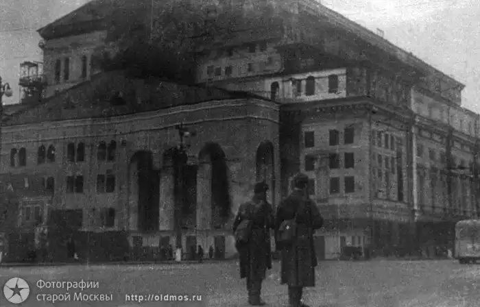 Прямое попадание авиабомбы в административное здание №4 по Старой площади. 24 октября 1941 года. Налёт более известен тем, что при бомбардировке политический деятель А.С.Щербаков получил контузию; почти у всех жителей Зарядья вылетели в домах стекла, а девушка-лётчик Люфтваффе была за выполнение задания лично награждена Гитлером.