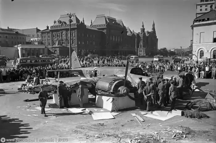 Сбитый фашистский бомбардировщик Ju 88. Площадь Свердлова.
