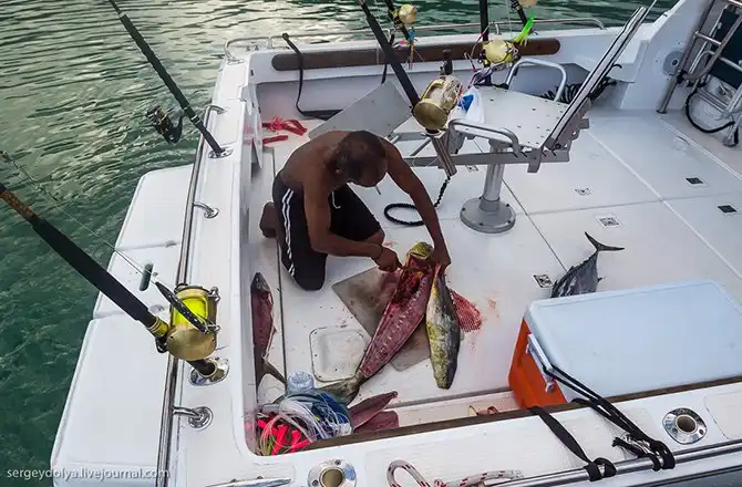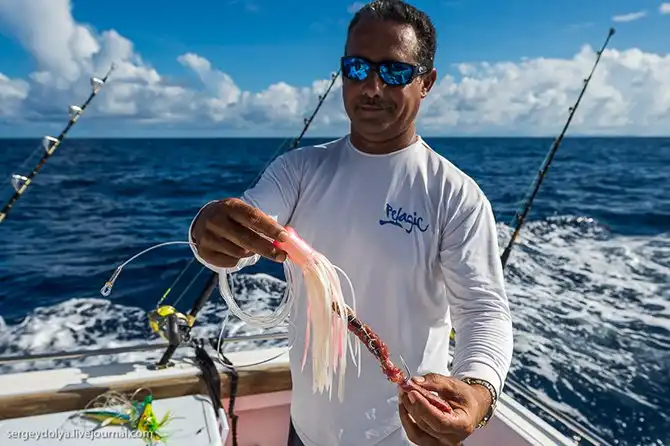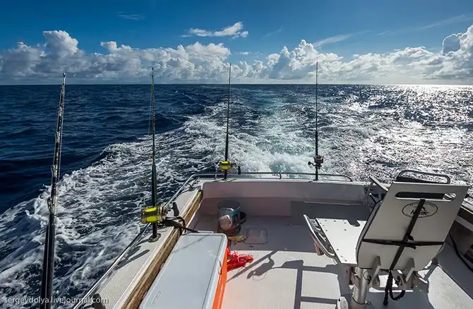 Уходим от острова на 40 километров. Сейшельские острова стоят на большом и широком плато, и десятки километров от берега идет одна глубина (около 50 метров). Место, где плато заканчивается «свал» – именно там обитает марлин и рыба парусник. По словам нашего гида, успешным уловом марлина заканчивается одна рыбалка из трех, это серьезный показатель: