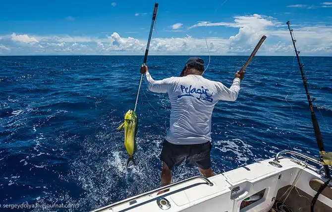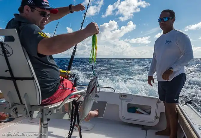 Второй добычей, внешне похожей на пожелтевший пальмовый лист, оказался дорада. Надо сказать, я был немного озадачен его размерами – часто вижу дорадо в собственной тарелке, и думал, что этот вид рыб куда меньше. Но потом мне пояснили: у вас в Москве дорадО, а это дорадА. Еще ее называют Махи-Махи. Разные рыбы. Посему, чтобы избежать дальнейшей путаницы, мы условились использовать ее местное название – махи-махи. Она еще, кстати, сыграет свою роль в этот день: