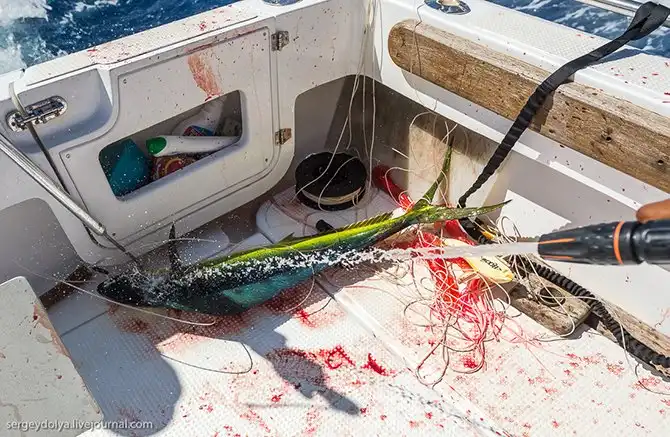 Когда я подтягиваю рыбину к борту, помощник цепляет ее багром и затаскивает на палубу:
