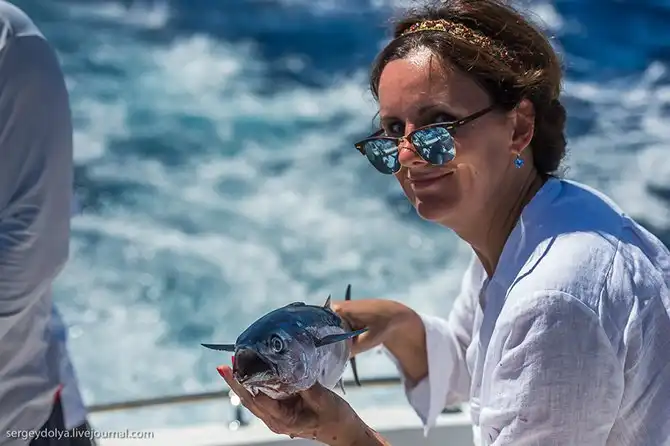 На третьей рыбе меня начало укачивать, а я крайне тяжело переношу качку. Даже совсем небольшую. Я выпил таблеток: морскую болезнь они не убрали, но навели на меня беспомощную дрему. В общем, я отправился в каюту вздремнуть часок-другой, а на время своего отсутствия назначил жену исполняющей обязанности рыбака: