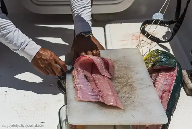 Заключительная часть нашей рыбалки – обед из пойманной рыбы. Приготовление улова разворачивается прямо на наших глазах. Сперва с чистой рыбы срезают большой ломоть. Затем с этого ломтя убирают шкуру. На разделочной доске появляется кусок нежнейшего рыбьего мяса: