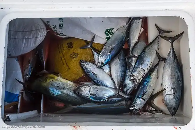 Итак, результат дня: 2 махи-махи, 4 рейнбоу раннера и 23 тунца. Увы, хитрый марлин не попался и на этот раз, но я по-прежнему не теряю надежд на нашу встречу. Хотя после этой качки, я начал было подумывать о завершении карьеры океанского рыболова: