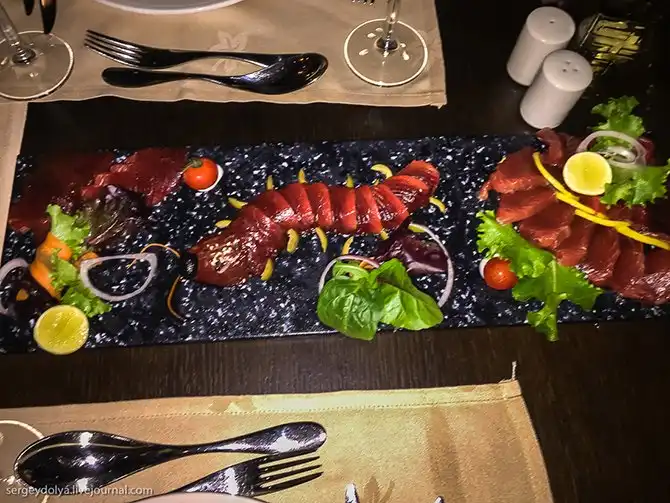 Затем принесли стейки. Первый кусок я проглотил в один момент, и чудом успел снять второй. Должен признаться, вкуснее рыбы я не ел, да простит меня байкальский омуль. Это самая свежая и самая вкусная рыба в моей жизни: