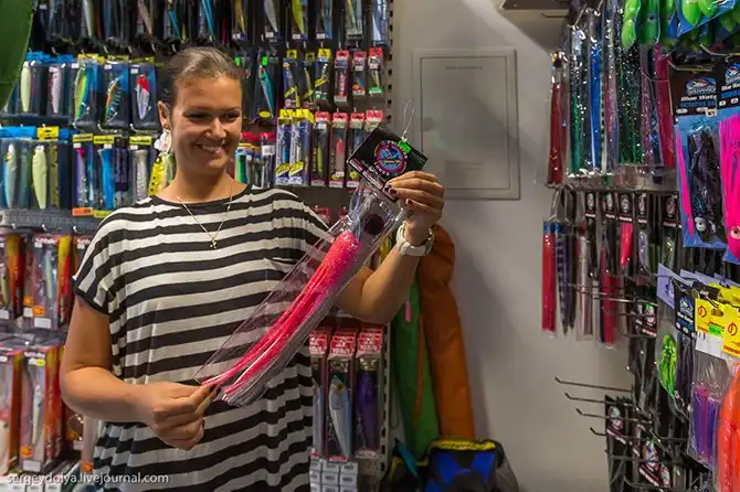 Чтобы понять масштаб некоторых блесен, я попросил продавщицу взять их в руки: