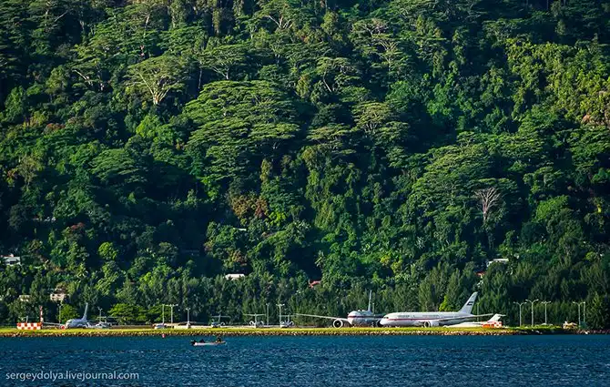 По пути проходим аэропорт Сейшел. С этой точки кажется, что взлетно-посадочная полоса находится прямо под горой: