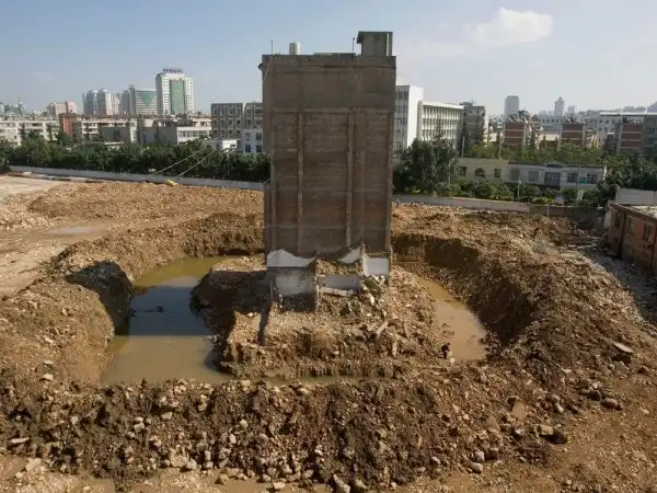 Шестиэтажный жилой дом на строительной площадке в Шэньчжэне. Владелец Чой Чу Чун и его жена Чжан Лянь Хао отказались принять компенсацию за снос их дома.