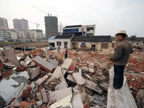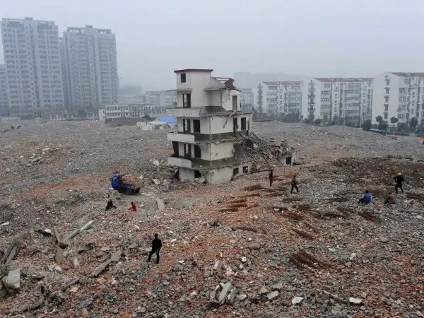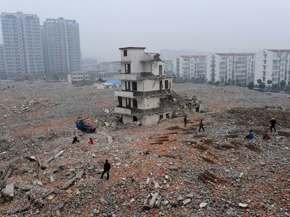 Пожалуй, самый известный дом-гвоздь. Пожилая пара отказалась подписать соглашение о сносе дома. В результате половину дома снесли, а оставшуюся часть окружила дорога. Провинция Чжэцзян.