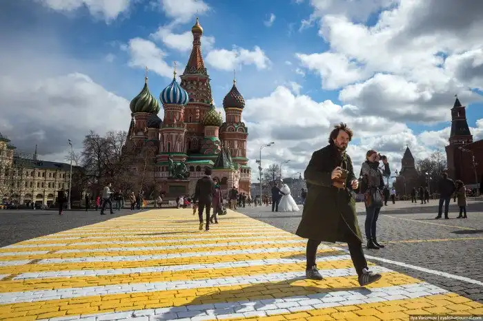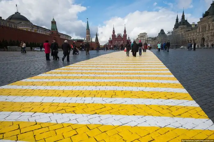 Неожиданно для жителей Москвы и ее гостей на брусчатке Красной площади появились яркие бело-желтые пешеходные переходы. В соответствии с новыми требованиями, которые предписывают выполнять «зебры» в ярких цветах, чтобы они были лучше видны водителям, Красную площадь теперь пересекают длинные двухцветные дорожки. Символ Москвы и России уже более 50 лет остается пешеходным и лишь изредка сюда заезжают служебные автомобили коммунальных служб и полиции. Примечательно, что туристы приняли «зебры» за предметы стрит-арта, пытались разгадать скрытый смысл и интересовались именами авторов.
