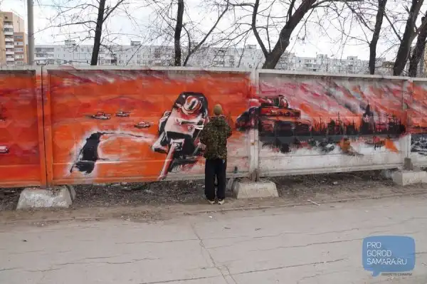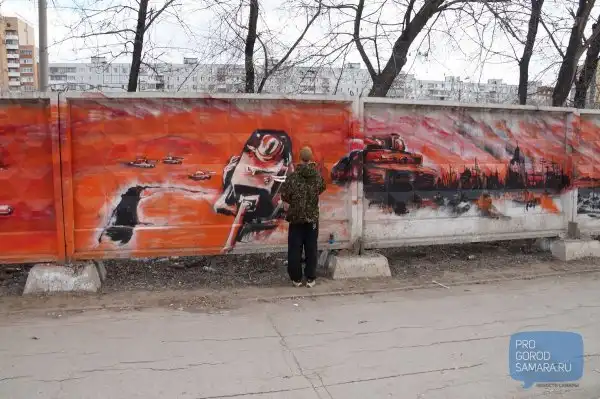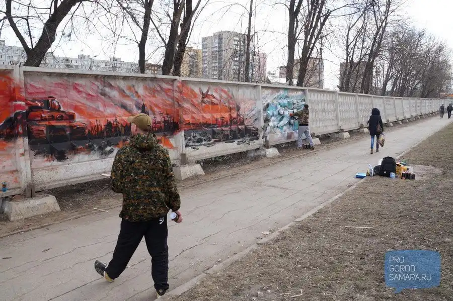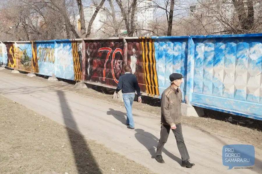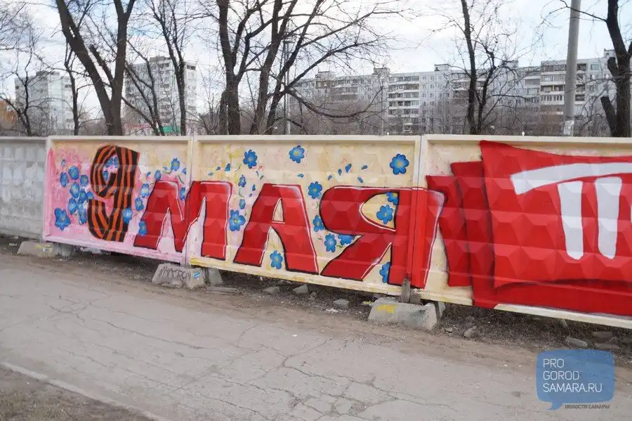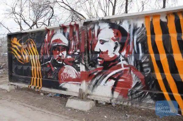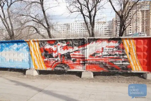 В середине апреля в Самаре стартовал проект патриотичных граффити, которые художники наносят на серые заборы яркие рисунки с симоволами и эпизодами Великой Отечественной войны. Некоторые работы самарских художников можно уже сегодня увидеть на Московском шоссе межу проспектом Кирова и улицей Димитрова. Конкурс граффити приурочен к 70-летию Победы.