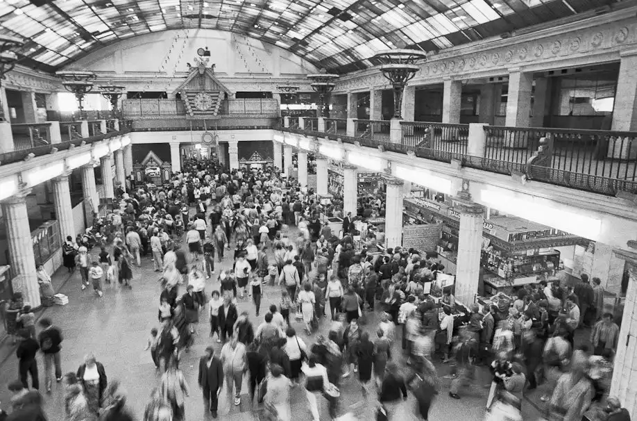 А это – как в 1990-х примерно выглядел внутренний зал… Народу относительно немного, но раньше в этом зале стояло куча разных отделов…