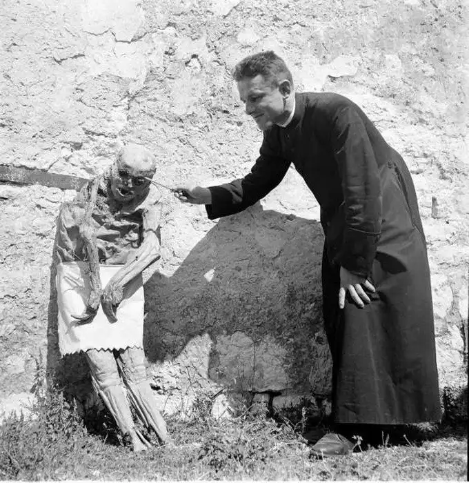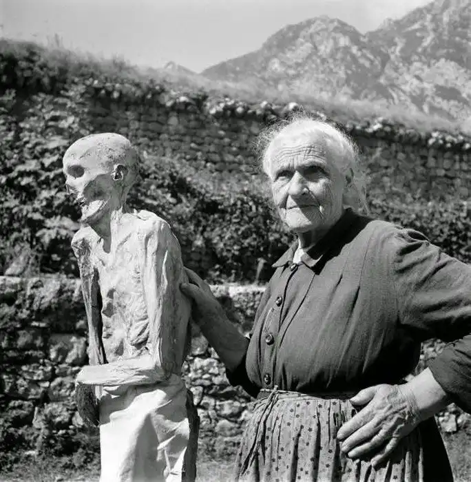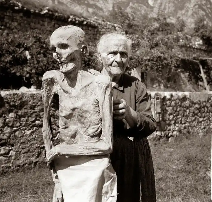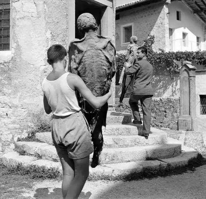 Эти снимки были сделаны в итальянской деревне Венцоне в 1950-м году. На них изображены люди, которые «выгуливают» мумий. Местные жители охотно фотографировались с мумифицированными телами усопших, «разговаривали» с ними, посещали церковь и привлекали туристов. Останки, прекрасно сохранившиеся от разложения в здешней почве благодаря грибку Hipha Bombicina, были найдены еще в 1647 году в склепе часовни на кладбище деревни, а спустя некоторое время появилась традиция «выгуливать» мумий. Сейчас уже этой традиции нет, да и из первоначальных 42-х мумий осталось лишь 15, остальные были уничтожены землетрясением 1976 года. В наши дни останки обрели покой в склепе св. Михаила, расположенном близ собора св. Андрея в этой же деревне.
