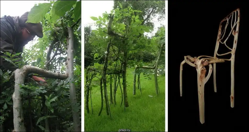 Первый этап заключается в посадке молодых деревьев. Затем ветви и стволы деревьев механически изгибаются до нужной формы. Ветви прививают друг к другу чтобы желаемый конечный элемент (например, стул) был цельным, без дополнительных соединительных элементов.