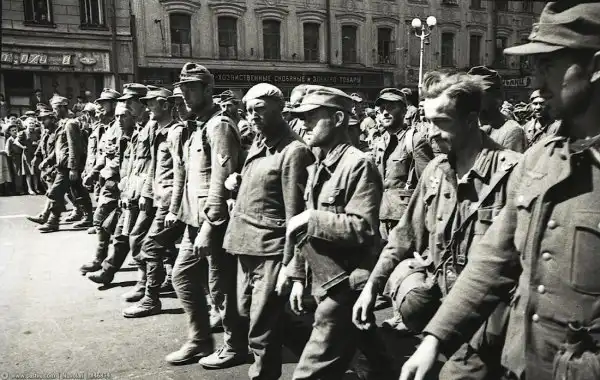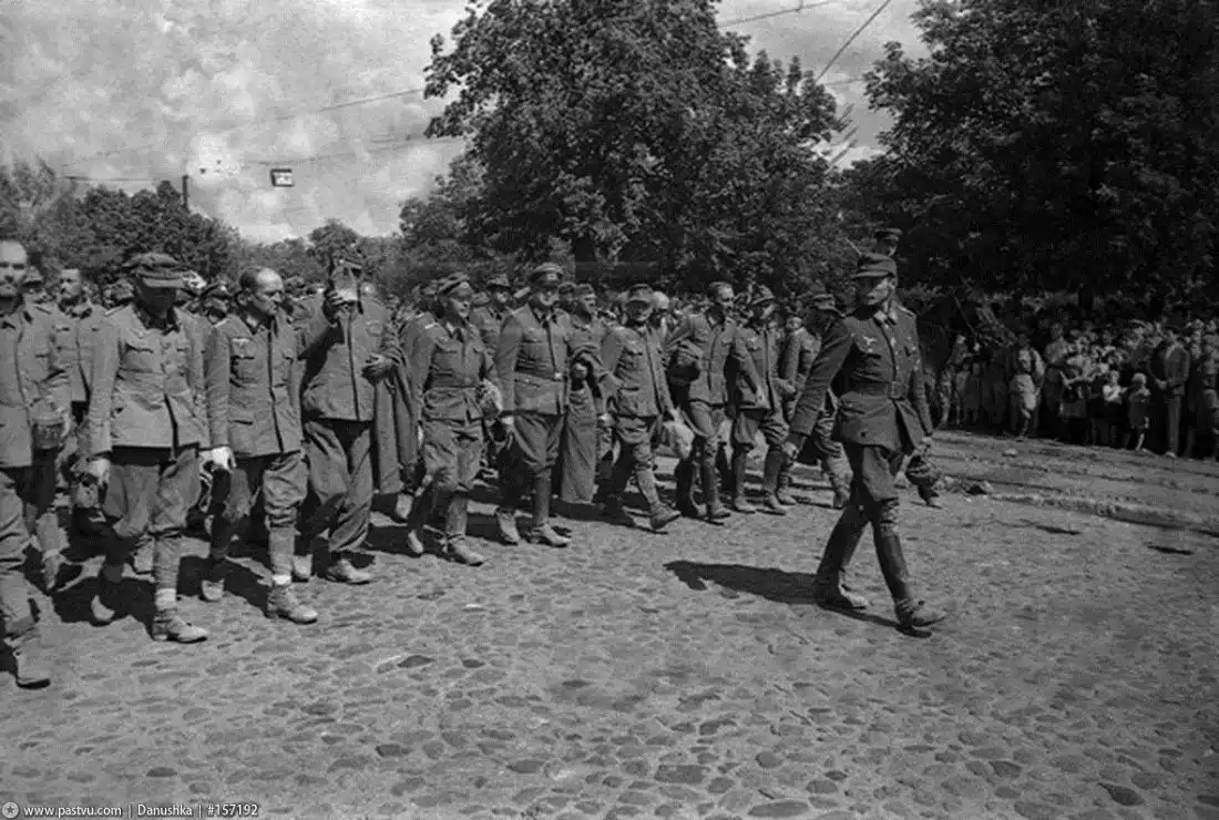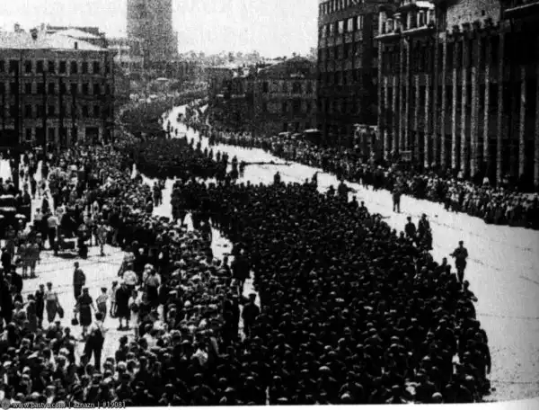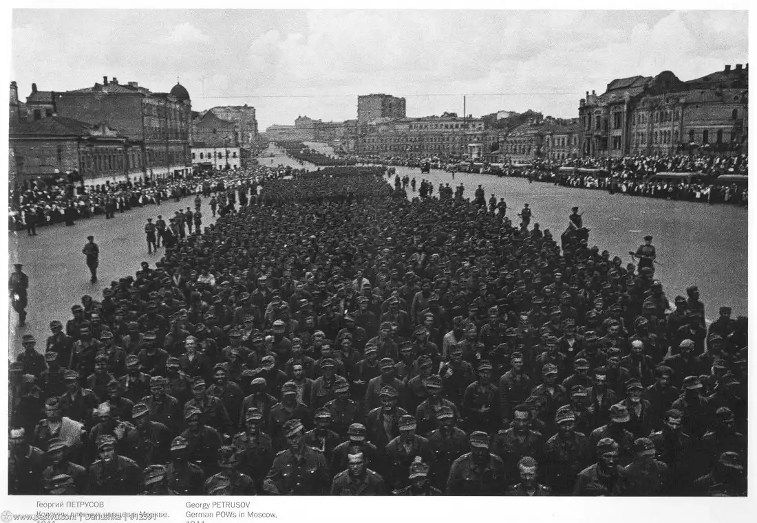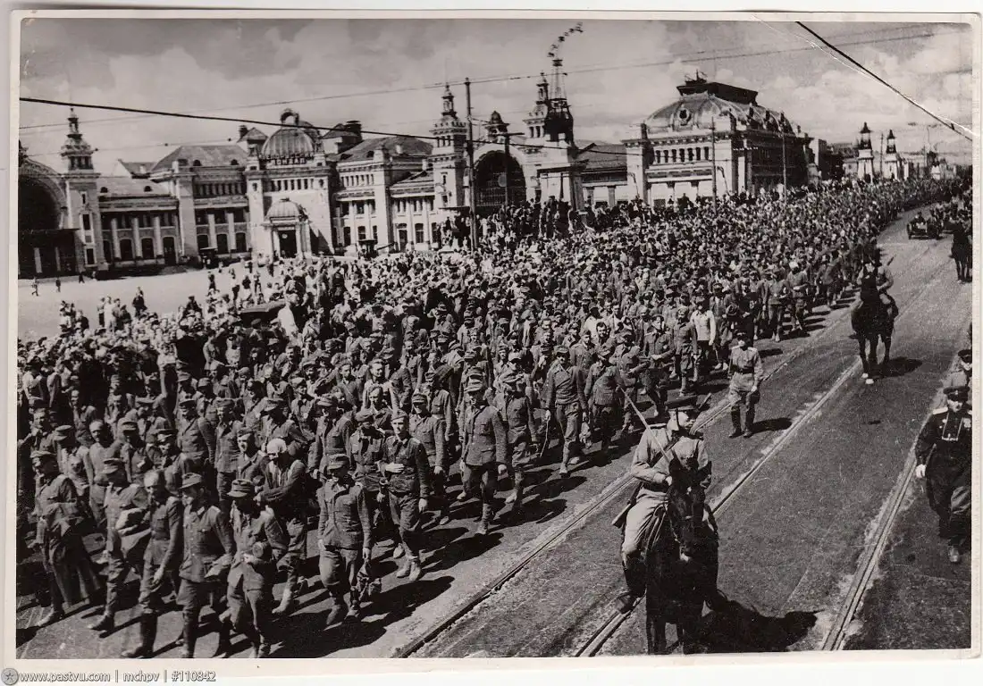 Марш немецких пленных по Москве. По улицам столицы 17 июля 1944 года прошло почти 58 000 немецких солдат и офицеров (включая 19 генералов), взятых в плен в ходе разгрома гитлеровских войск в Белоруссии. Перед маршем их содержали во временных лагерях на Московском ипподроме и на стадионе "Динамо".