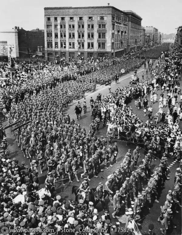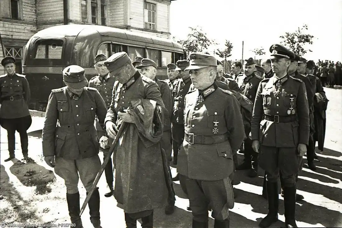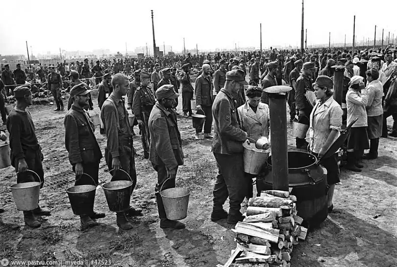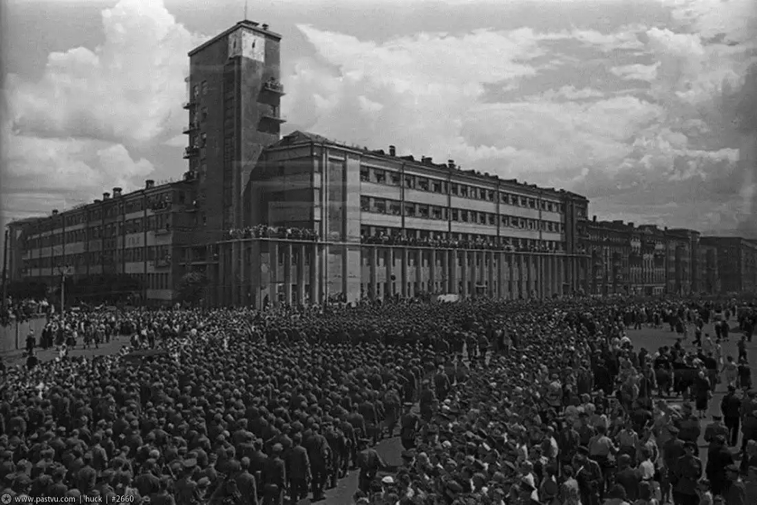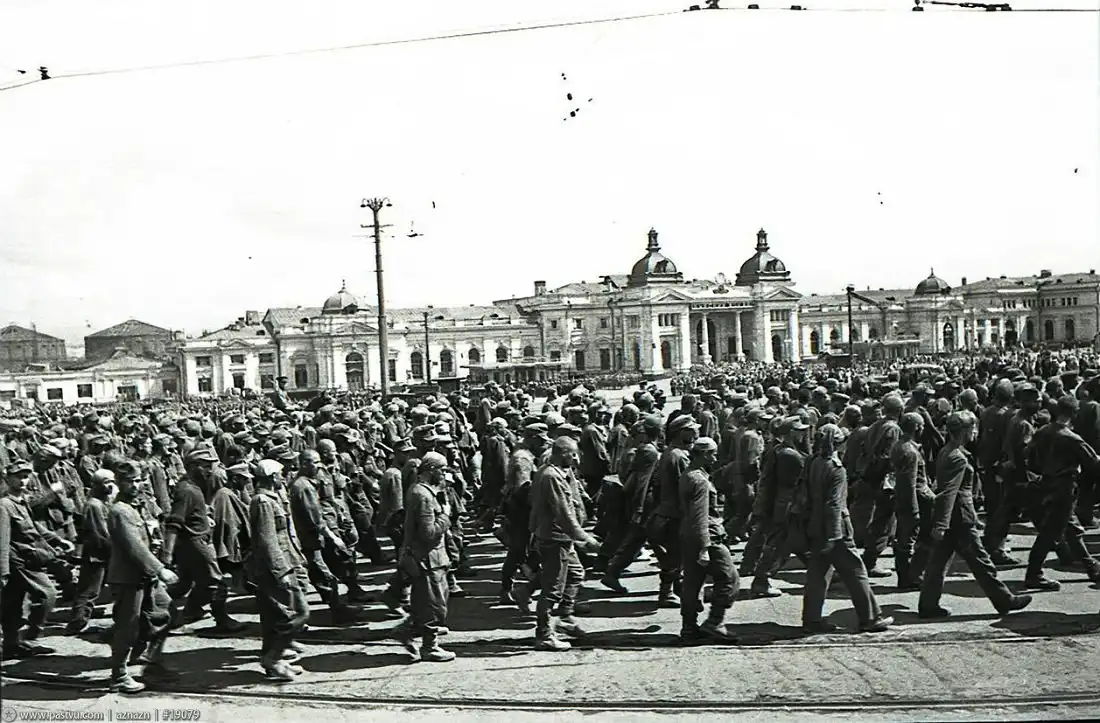 Марш немецких пленных по Москве. По улицам столицы 17 июля 1944 года прошло почти 58 000 немецких солдат и офицеров (включая 19 генералов), взятых в плен в ходе разгрома гитлеровских войск в Белоруссии. Перед маршем их содержали во временных лагерях на Московском ипподроме и на стадионе "Динамо".