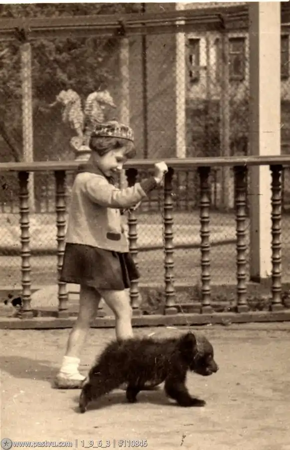 У площадки молодняка в Московском зоопарке. На снимке – Люда Чаплина, дочь создательницы площадки молодняка, знаменитой писательницы Веры Чаплиной, вместе с медвежонком Тапочкой. Лето 1944 года.