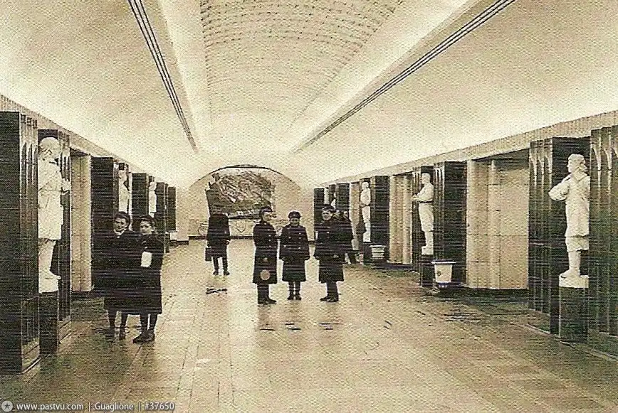 Станция метро "Бауманская". Здесь видно, что изначально скульптуры были белыми.