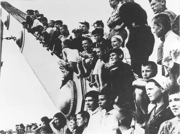 Мальчишки смотрят на колонны пленных немцев, цепляясь за опоры Крымского моста.