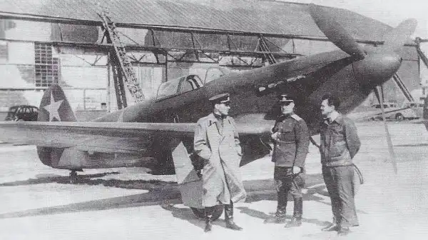 Авиаконструкторы Александр Яковлев и Олег Антонов и лётчик-испытатель Павел Федрови возле истребителя Як-3 на Центральном аэродроме в Москве.