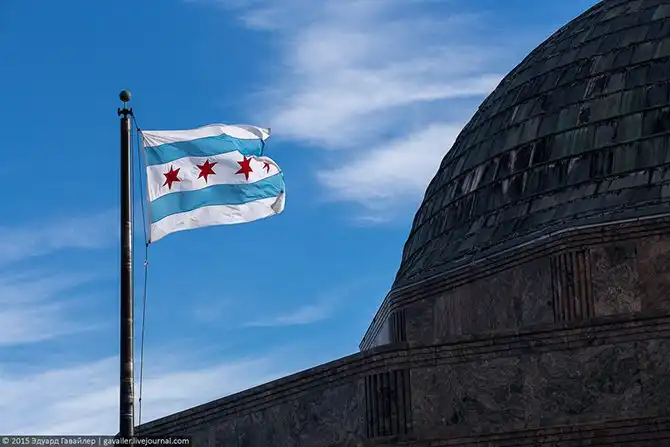 Официальный флаг Чикаго: 4 звезды, 2 голубые и 3 белые горизонтальные полосы. Белые полосы – северная, западная и южные части города. Верхняя голубая полоса – озеро Мичиган, нижняя голубая полоса – южная ветка «Великого» чикагского санитарно-судового канала. 4 звезды – форт Дирборн, Великий чикагский пожар, всемирная выставка, выставка Век Прогресса.