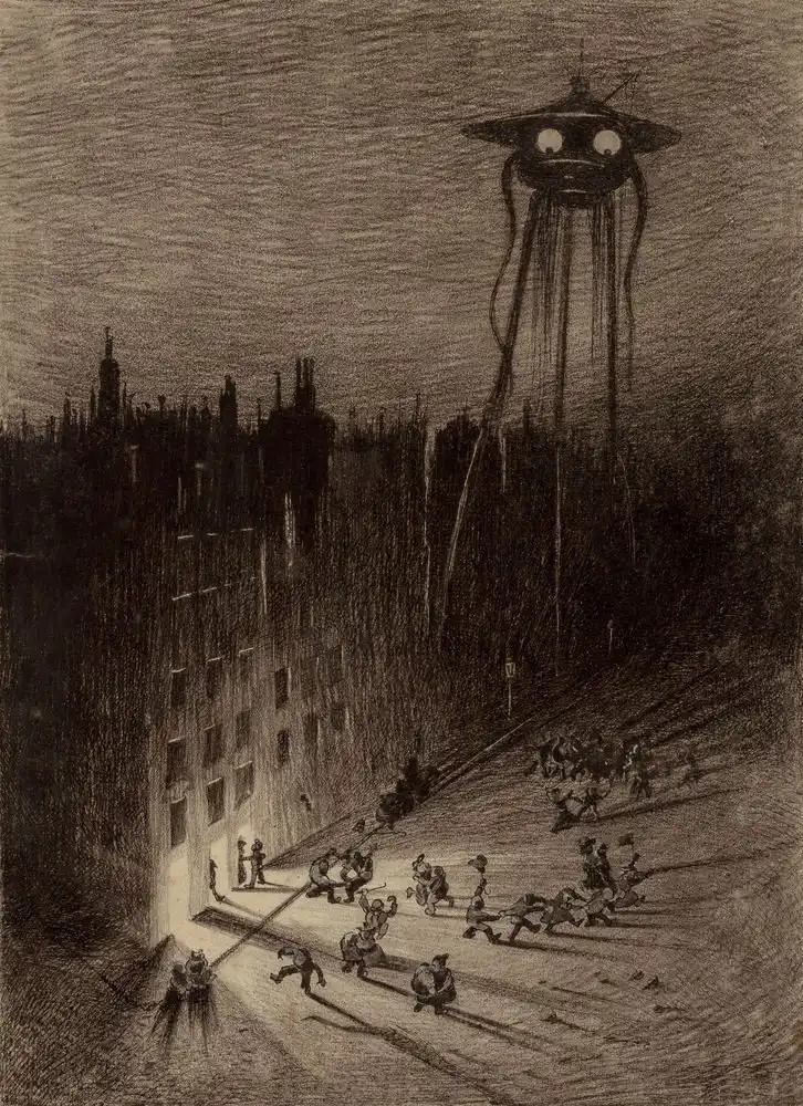 Роман Герберта Уэллса «Война миров», опубликованный в 1897 году, стал одним из самых ранних литературных произведений о войне между землянами и инопланетянами. Перед вами шикарные рисунки бразильского художника Энрике Алвим Корреа к культовому научно-фантастическому роману.
