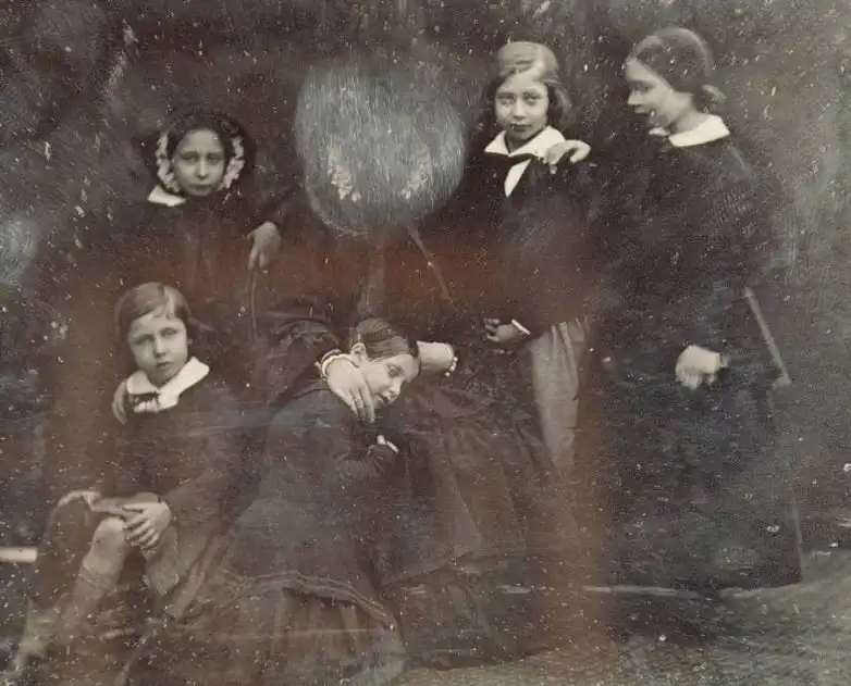 Королева Виктория с детьми, 1852. Королева лично стерла с фотокарточки своё лицо – ей не понравилось, как она получилась