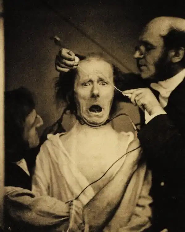 Невропатолог де Булонь подвергает этого беднягу разрядам электрического тока, чтобы изучить мускулы его лица, 1860