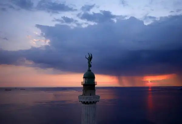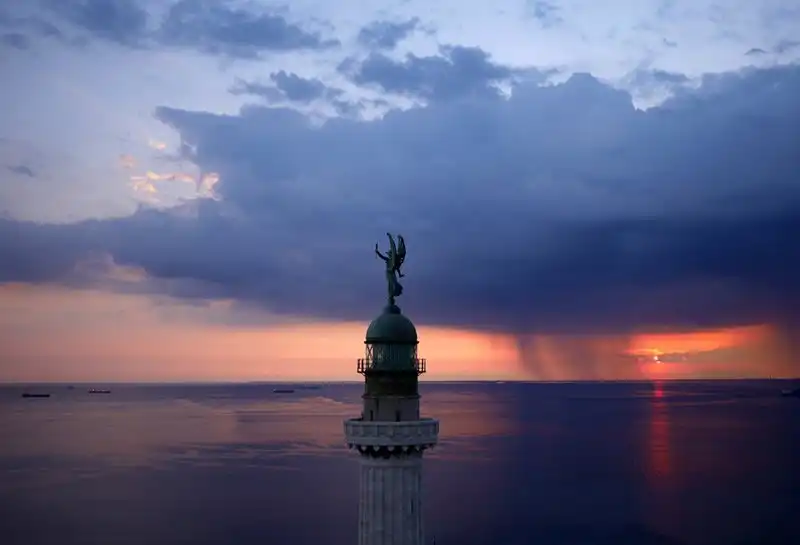 Маяк Фаро делла Виттория (маяк Победы) на закате с видом на залив в городе Триест