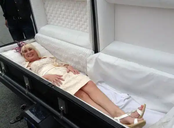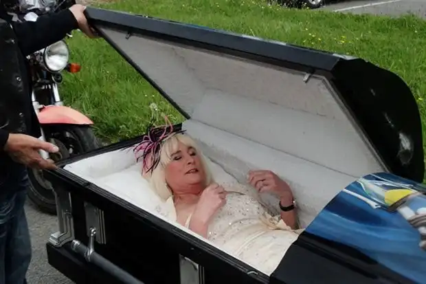 58-летняя Дженни Баклефф выбрала достаточно эффектный способ появления на собственной свадьбе. 51-летний будущий супруг экстравагантной дамочки Кристофер Локетт получил невесту в торжественной упаковке в виде гроба. Учитывая возраст дамочки, шутка слегка неудачная.
