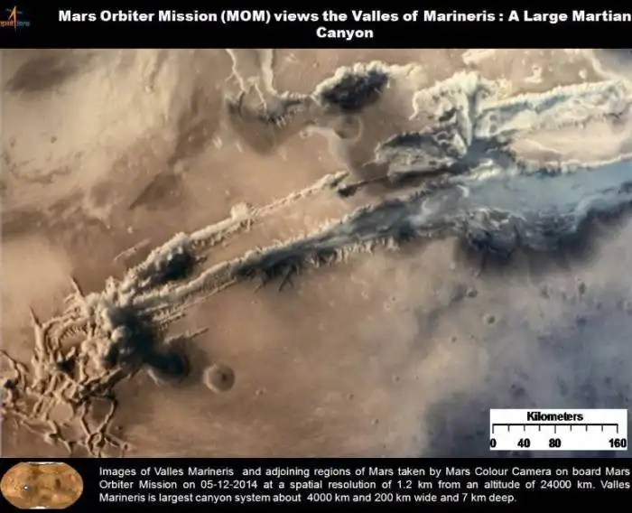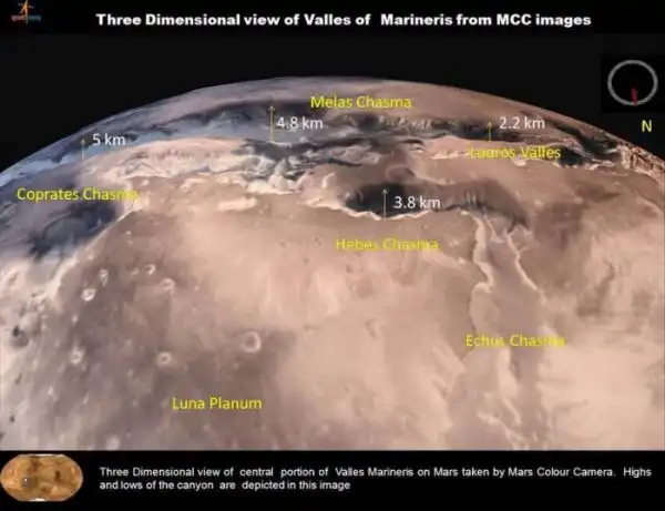 Помимо прочего индийские астрономы опубликовали и ЗD изображение центральной части Долины Маринер, на которой мы можем видеть перепады высот этого интересного места на Марсе. Большинство исследователей полагают, что долина Маринер образовались на ранних этапах формирования Марса в результате остывания планеты. Ширина каньонов со временем увеличилась в результате эрозии.