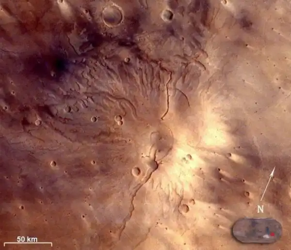 Еще одно изображение марсианского вулкана, известного как гора Патера Тиррения (Tyrrhenus Mons). Это один из старейших вулканов на Марсе. Как следствие значительного возраста, он имеет довольно много радиальных оврагов на своих склонах.
