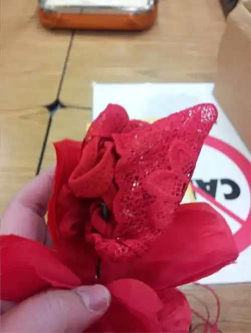 Подобную розу ученик подарил своей школьной учительнице, однако, та, ничего не заподозрив, принесла букетик домой. Неладное заметил муж женщины, который очень удивился тому из чего был сделан цветок. Сам ученик говорит, что купил розочку в магазине цветов, но верится в это с большим трудом.
