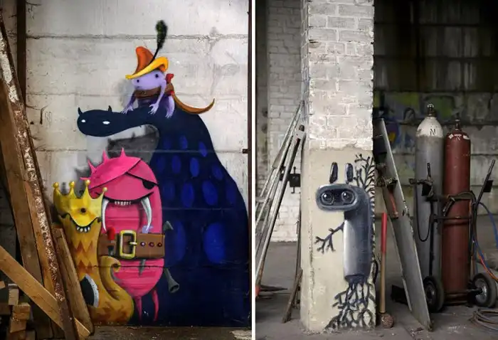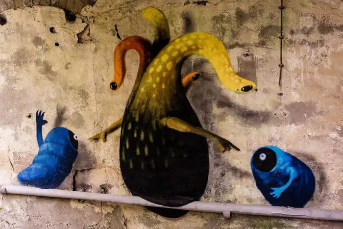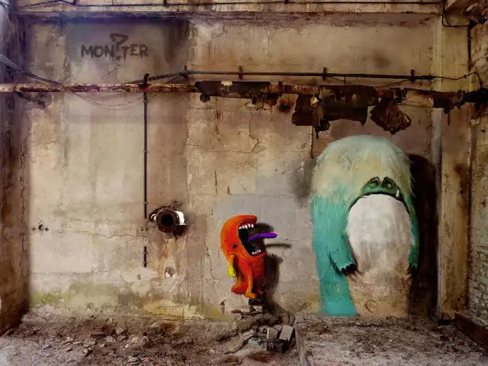 Заброшенные здания Берлина недавно облюбовали забавные монстры, которые родились благодаря творчеству молодого уличного художника Кима. Мастер граффити Kim Kwacz, он же Kim Kоster, показал, что монстры могут быть не только страшными, но еще и милыми, веселыми и любопытными. Проект под названием Monzter стал частью нового мобильного приложения для детей, благодаря которому ребенок может получить ответы на многие интересующие его вопросы.