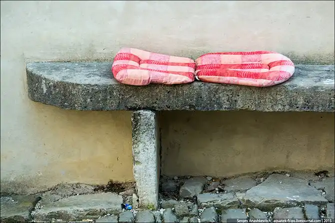 Подушки, заботливо уложенные на каменную скамейку кем-то из жителей.