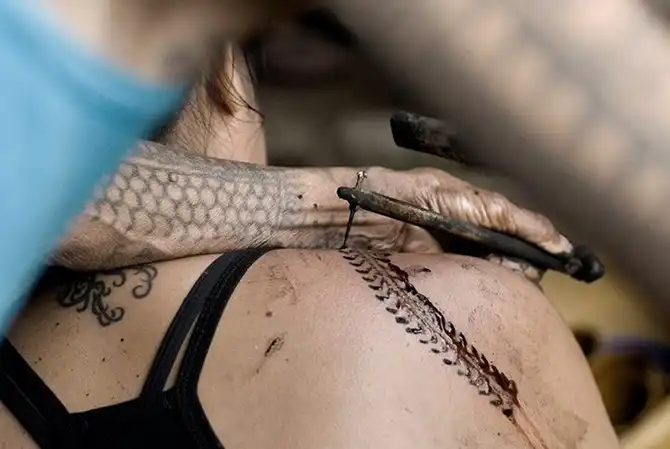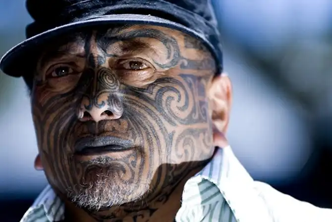 Это традиционная татуировка народа маори. В былые времена наносилась она с помощью зубила «ухи». Его опускали в краску, после чего размещали на коже и ударяли по зубилу специальным молотком. Такая техника сильно травмировала кожу, иногда проколы на лице были сквозные. Краситель состоял из угля древесины упавшего агатиса, вероники или жженых кордицепсов, лекарственных растений и растительного масла. Современные же мастера предпочитают использовать обычную машинку и инструменты. Узорами моко покрывается нижняя часть тела и лицо.