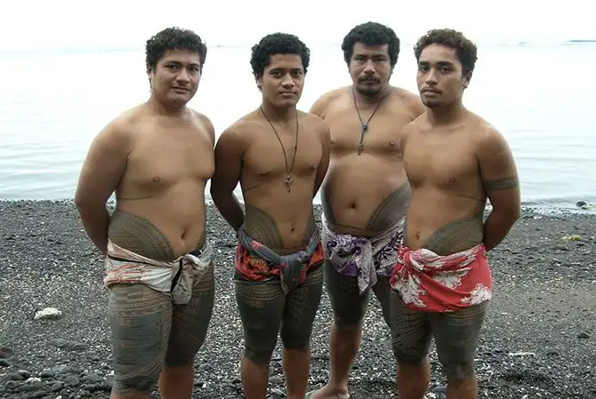 Предполагается, что от названия именного этого стиля произошло слово «тату». На таитянском диалекте слово «татау» обозначает рисунок. Татуировка имеет две разновидности: мужскую — пe-a, от талии до колен, иногда включающая руки и запястья, и женскую — малу, от верхней части бедер до колен. Татуировки наносят используя широкий гребень и краситель на основе сажи.