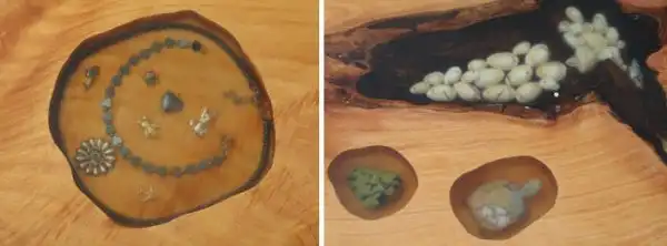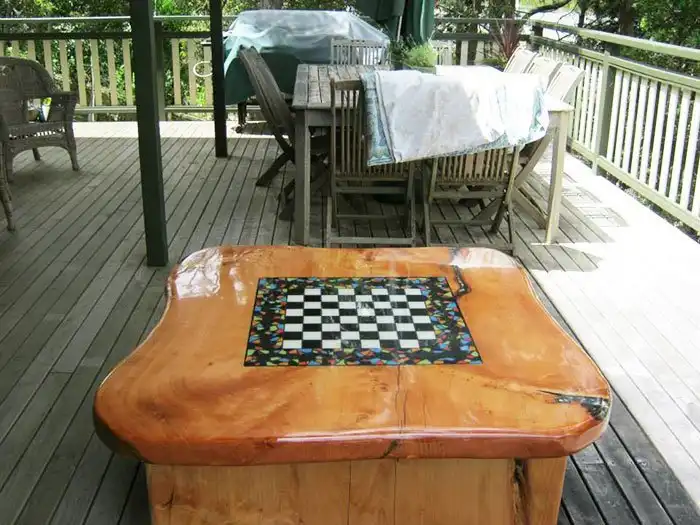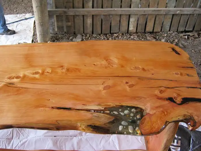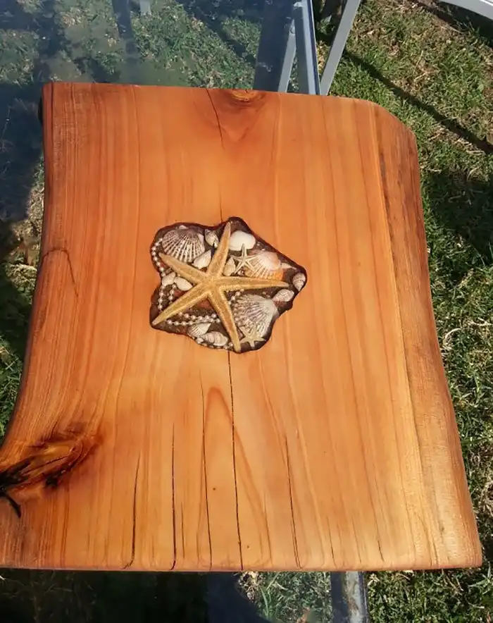 К сожалению, не всё в природе бывает идеально и совершенно, так что иной раз в древесных заготовках встречаются трещины и даже полые места, которые необходимо заполнить перед использованием. Вот как решила эту естественную проблему одна креативная деревообрабатывающая компания из Новой Зеландии: дыры и трещины их дизайнеры заполняют прозрачной эпоксидной смолой, в которую вкраплены морские ракушки, камешки, листья растений и сухоцветы или даже насекомые.