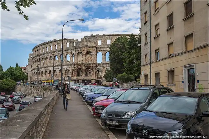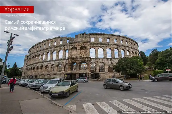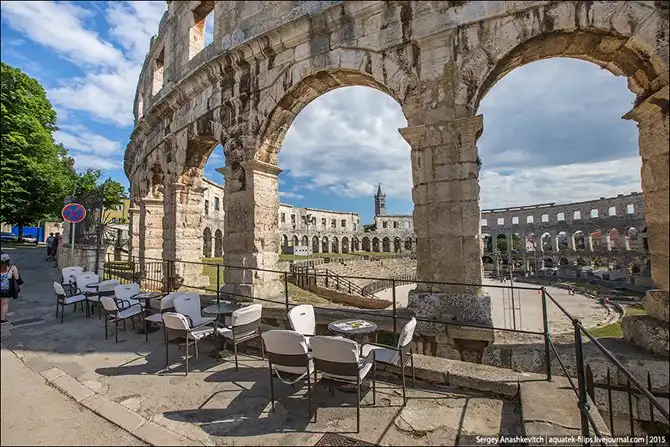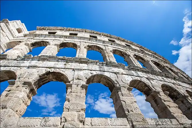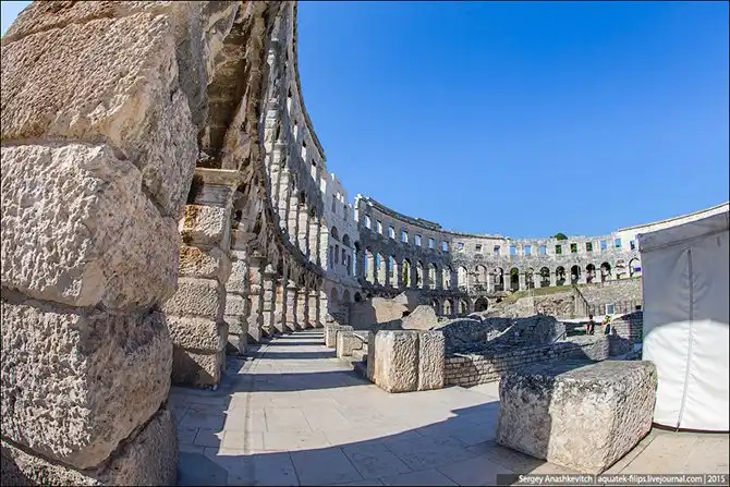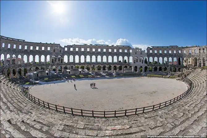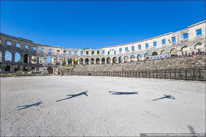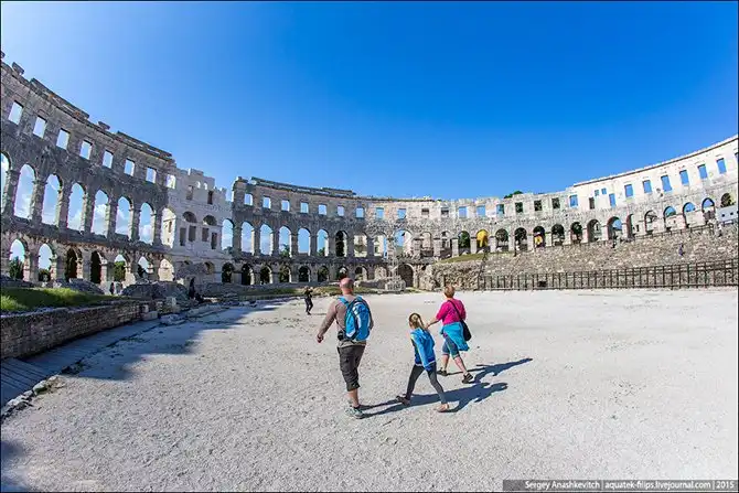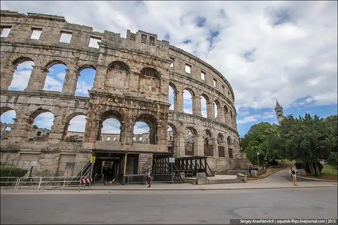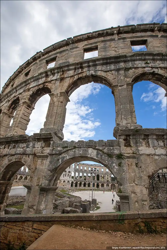 Наиболее сохранившийся за более, чем 20 веков амфитеатр, является 5 по размеру и находится в хорватском городе Пула. Когда я узнал об этом, находясь под стенами этой некогда кровавой арены, у меня просто отвисла челюсть.