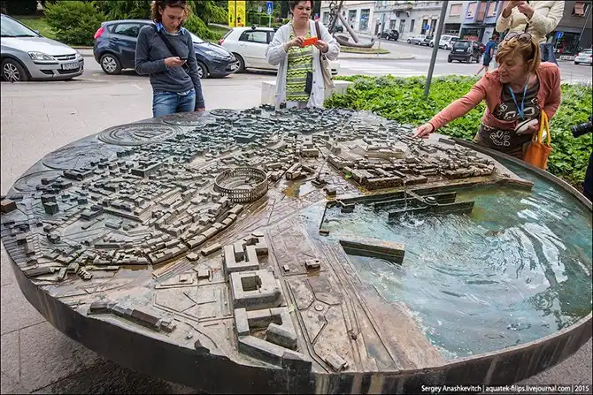 Потом экскурсовод подвела нас к необычному фонтану, выполненному в виде карты старой Пулы, центром которой является амфитеатр. Здесь она сказала о том, что архитектором арены был тот же архитектор, который строил Колизей….