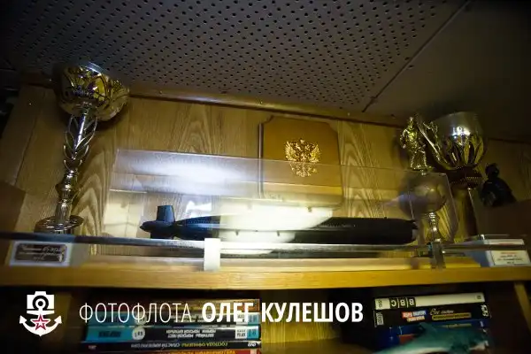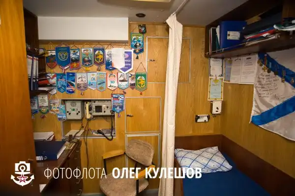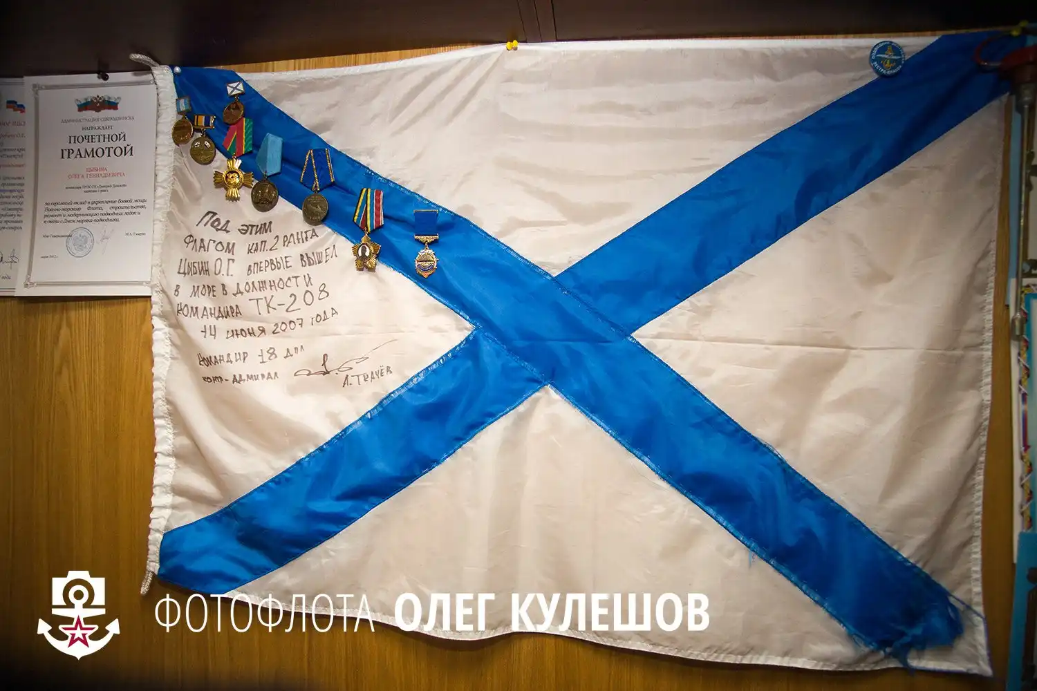 Каюта командира. Под этим флагом капитан 2 ранга Цыбин.О.Г. впервые вышел в море в должности командира ТК-208. 14 июня 2007 года. Командир 18-й дивизии подводных лодок контр-адмирал А.Ткачев.