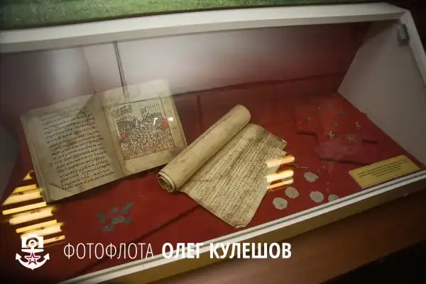 Сказание о Мамаевом побоище (лицевая рукопись XVII века), духовная грамота великого князя Дмитрия Ивановича (1389 г.), золотоордынские монеты XIV века, нательные крестики XIV века.