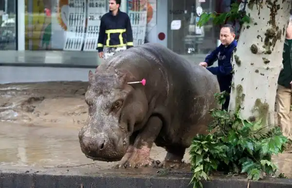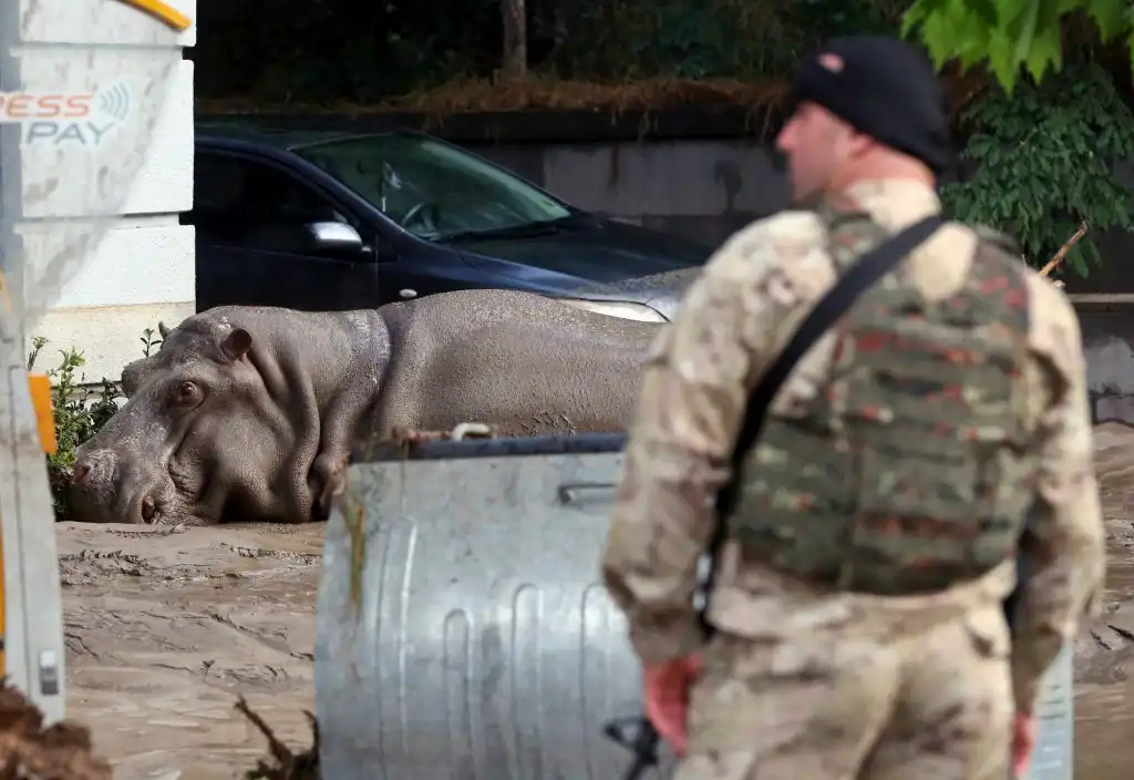 На бегемота, сбежавшего из затопленного зоопарка в Тбилиси, уже начало действовать успокоительное средство и он прилёг.