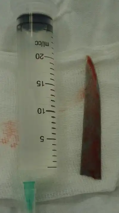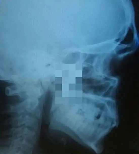 Нередко врачи вынуждены извлекать из тел людей самые необычные посторонние предметы, которые не должны были там находиться. В данном случае из мягкого нёба мужчины достали лезвие небольшого ножа, вошедшего под скуловой дугой во время драки. Случилось это за месяц до обращения за медицинской помощью, а беспокоиться пациент начал только потому, что нащупал нечто постороннее в нёбе.