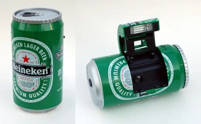 Следующая камера не является антиквариатом, но в коллекцию вписалась идеально. Кому не понравится фотоаппарат в виде банки? Эти 35-миллиметровые камеры маскируются под банки нескольких лейблов пива и содовой. Выпускаются они в Гонконге c 1998 года.