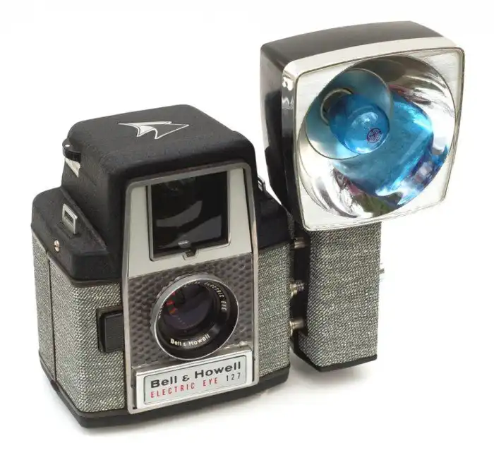 Bell & Howell была известна прежде всего своими популярными кинокамерами, но компания также выпустила несколько фотокамер, самой примечательной из которых является Electric Eye 127 (1958 год) - металлическая камера, которая была доступна в двух цветовых схемах: серебристая с черным дерматином и черная с серым джинсовым покрытием.