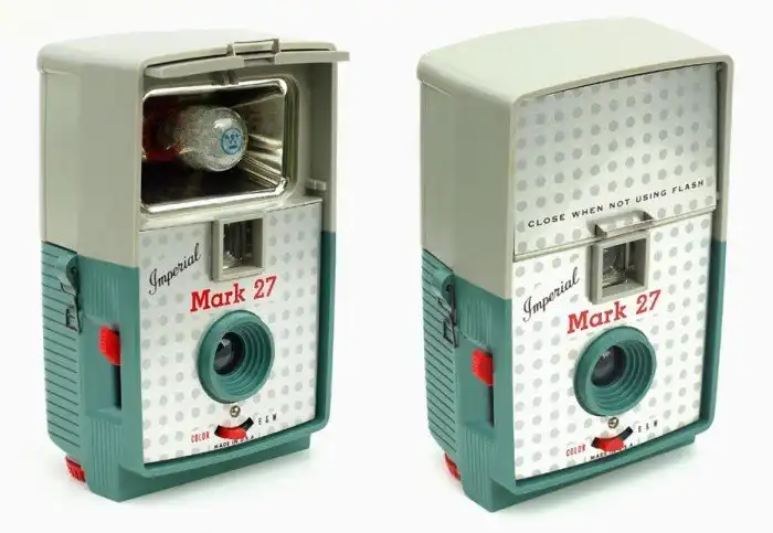 Imperial Mark 27 - изящная пластиковая камера со скрытой вспышкой, выпущенная чикагской компанией Herbert George Co в 1950-х годах. С помощью Mark можно было делать цветные слайды, цветные снимки и черно-белые снимки.